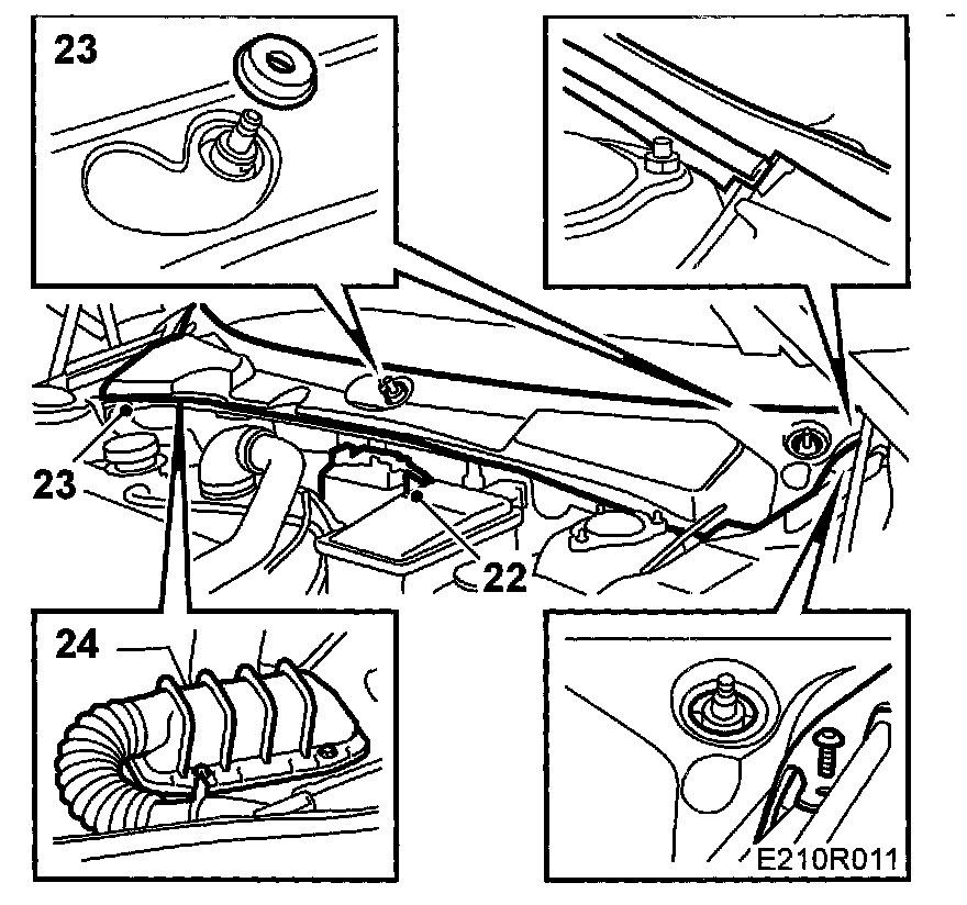 Note: The plastic hooks go under the windscreen. The cover panel must first be pulled forwards.