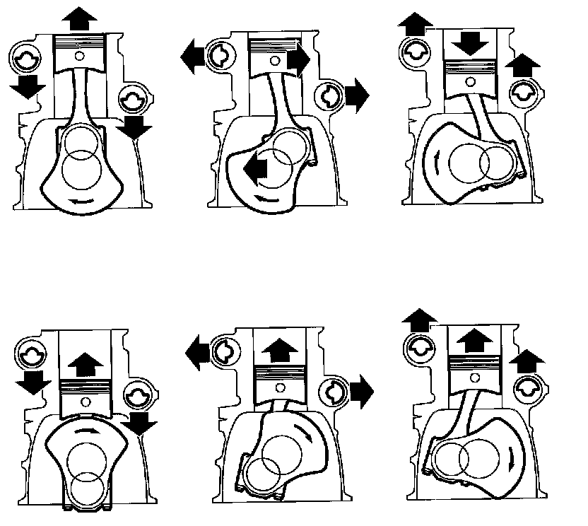During the power stroke the piston is pressed against the cylinder wall due to the angle of the connecting rod relative to the cylinder. At higher engine speeds, however, the inertial force is much greater. It can then be said that the crankshaft pulls the piston down and due to the angle of the connecting rod relative to the cylinder the piston is pressed against the cylinder wall, but this time on the opposite side. The combined gas and inertial forces acting in a sideways direction vary periodically twice per crankshaft revolution and cause the engine to vibrate in a lateral direction.
