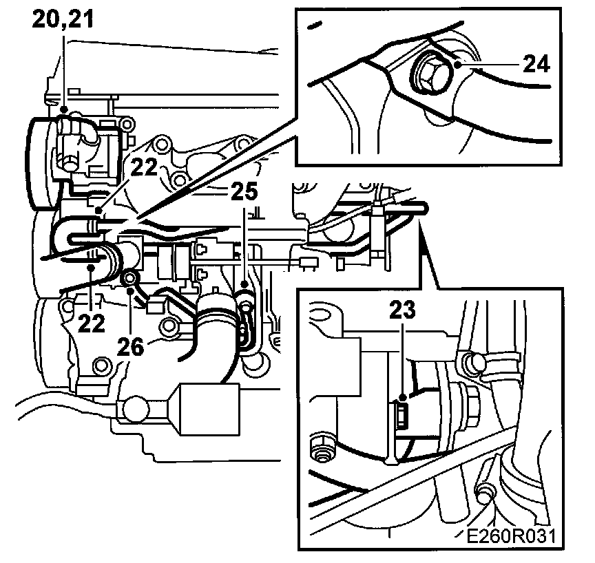 23. Detach the two longitudinal coolant pipes from the engine block.