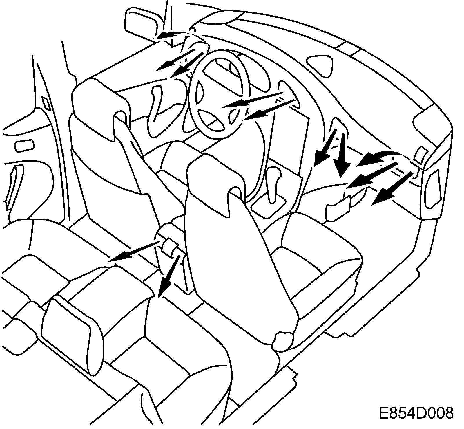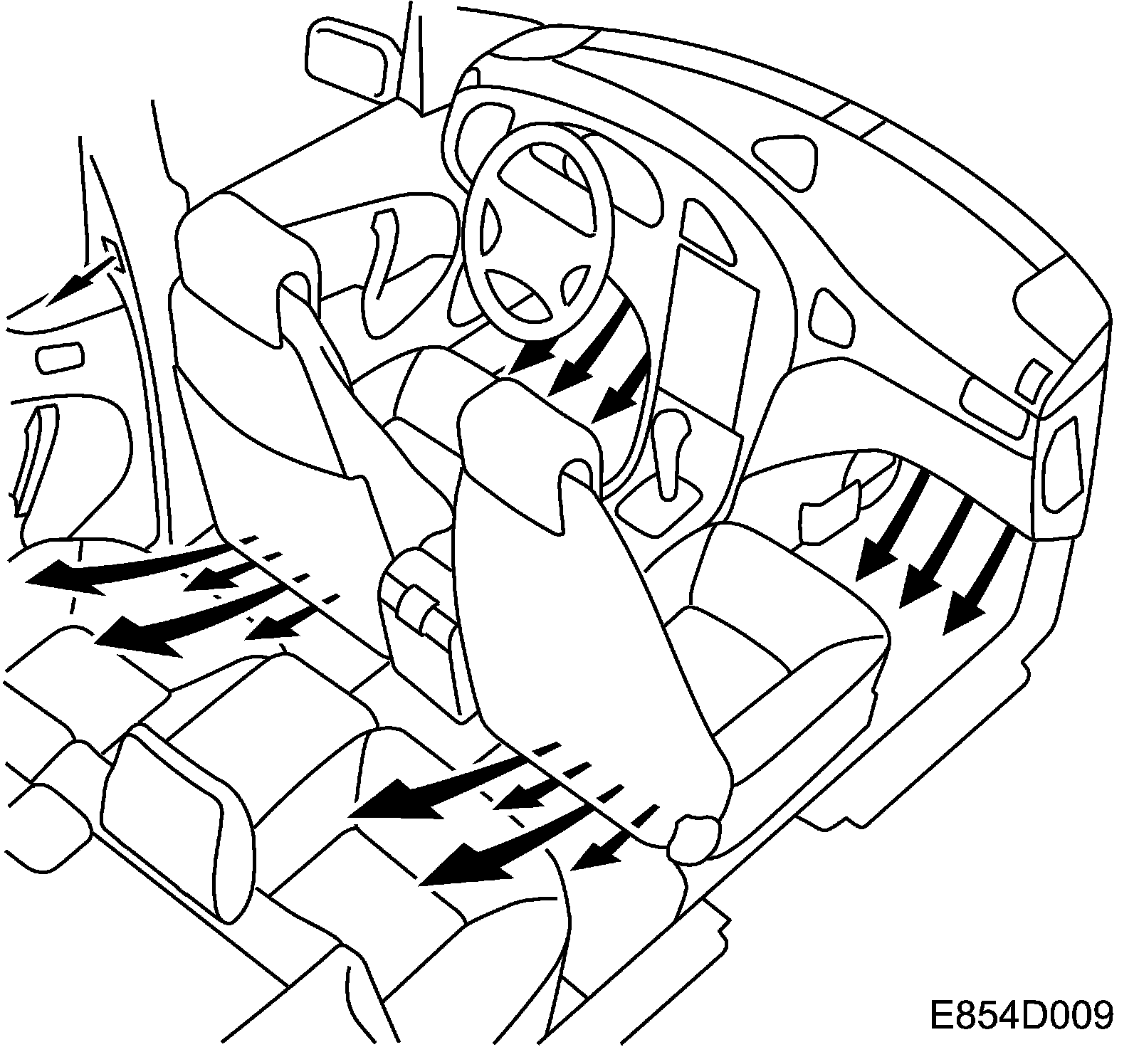 Air is directed to the air outlets under the dashboard, under the front seats to the rear floor ducts and to the B-pillar duct for the rear side windows.