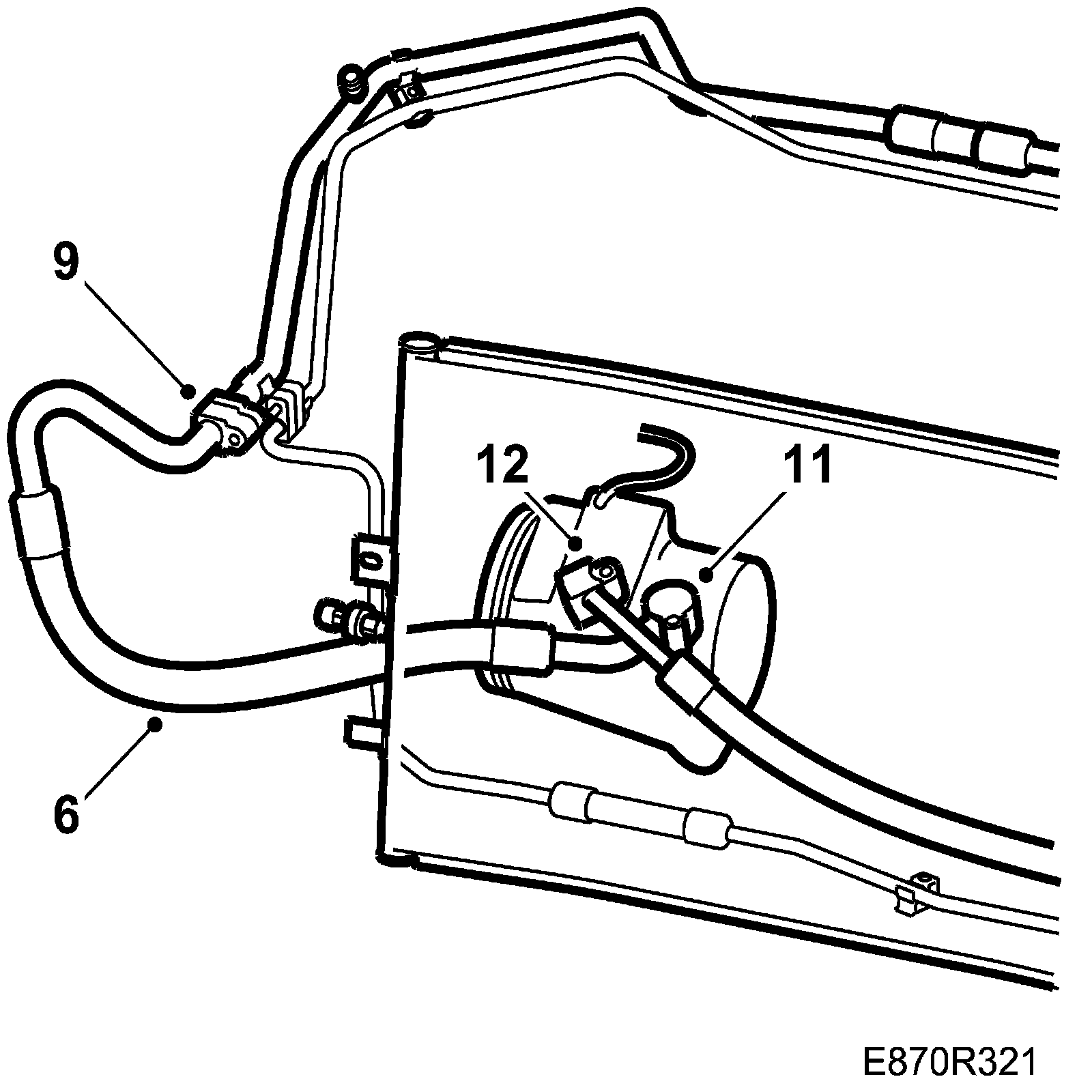 NOTE: Begin by inserting the pipe from the structure out in the right wing in front of the air filter, into the engine bay and up to the compressor above and behind the existing pipes to the inlet for power steering.