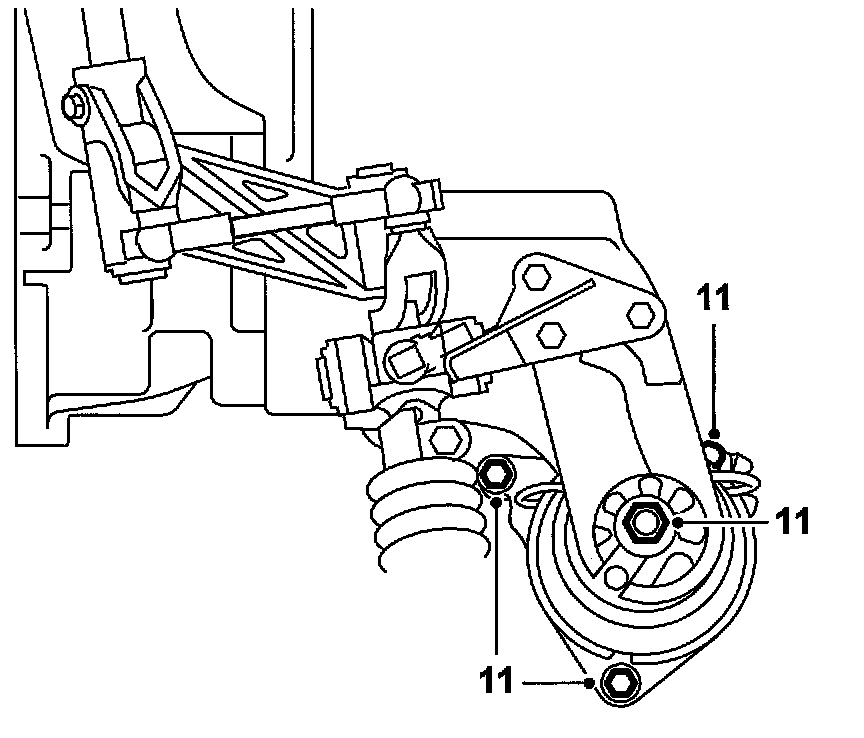 11. Undo the bolts securing the rear engine cushion to the subframe and the nut securing the engine cushion to the engine mounting.
