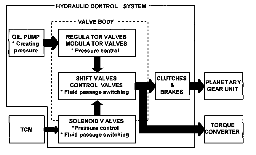 Depending on the pressure built up by the pump and the selector lever position, the hydraulic control system controls the hydraulic pressure that actuates the torque converter clutch and other clutches and brakes to suit the current type of driving.