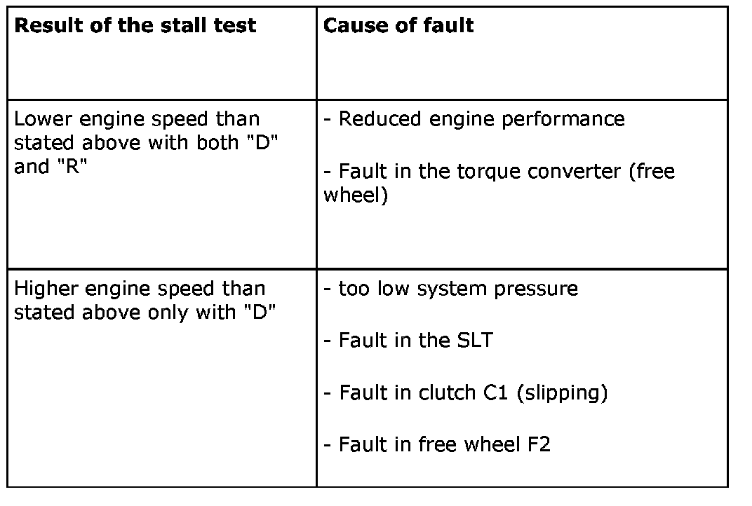 Checking the stalling speedThis test indicates the general condition of the engine and transmission by checking the maximum engine speed in positions D and R. To check the stalling speed: