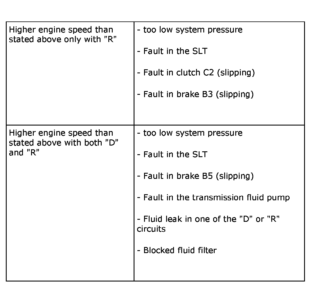 7. Repeat the test with the selector lever in position R. Stalling speed should be the same as above.