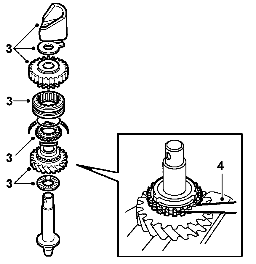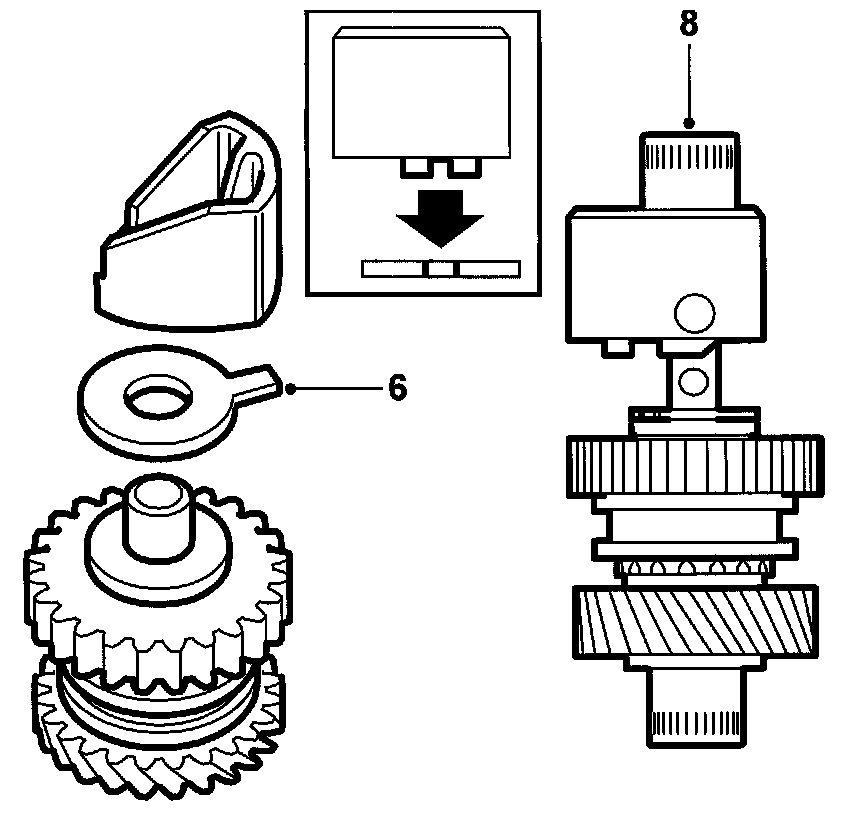 10. Check that the reverse gear is correctly assembled by measuring using a feeler gauge. Measure between the upper pinion and the thrust washer at the reverse shaft support. Play should be 0.10 - 0.20 mm.