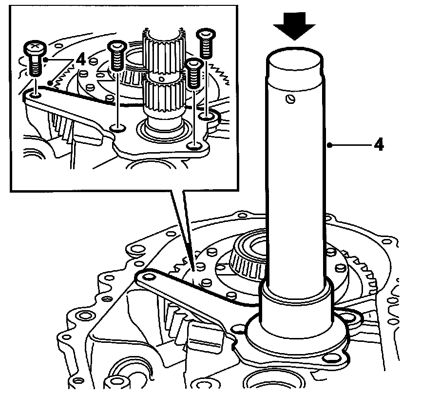 Undo and remove the 4 screws from the bearing support. Refit the bearing support together with the correct package of shims and tighten alternately.