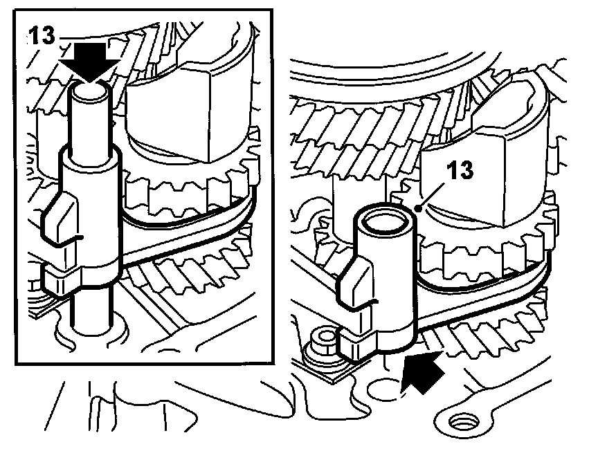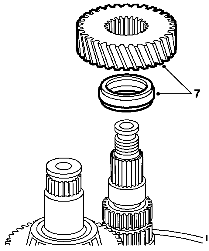 IMPORTANT: The synchromesh sleeve must only be positioned on the synchromesh hub where the high lugs on the synchromesh sleeve are located, aligned with the tooth gaps on the synchromesh hub that are between the deep tooth gaps according to the illustration.