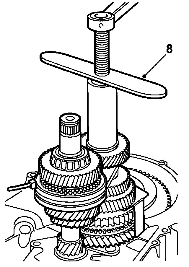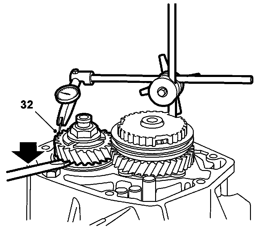 32. Engage 1st gear and press down the 5th gear synchromesh sleeve so that the gearbox is "locked". Tighten the nut and measure alternately with the dial indicator until the axial play of the output shaft is 0.06 ± 0.05 mm. Use a short M8 screw in the sealing plane as break point. Disengage 1st and 5th gears.