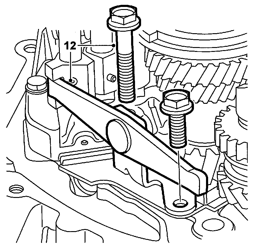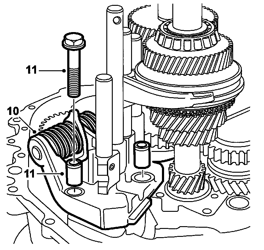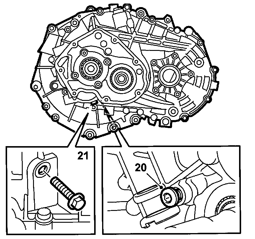 21. Tighten a new flange bolt (quality 10.9) to the reverse shaft support. If a 10.9 bolt was already used, this can be refitted. (The quality designation is stamped on the head.) The flange bolt specified above must not be fitted to gearboxes lacking a sufficiently large flange seat. The large flange has [diameter] = 21 mm, and the small [diameter] = 17 mm.