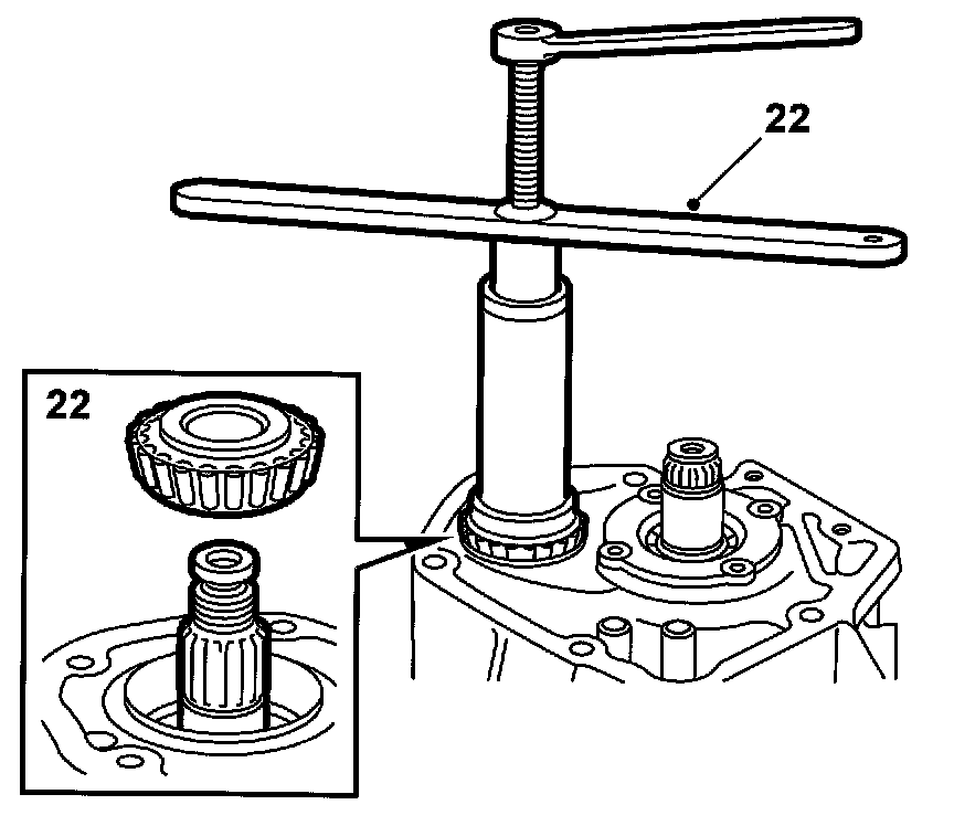 22. Fit the bearing to the output shaft, lubricate the bearing and tighten using 87 91 261 Puller, pinion. Only pull to contact with the clamping sleeve.