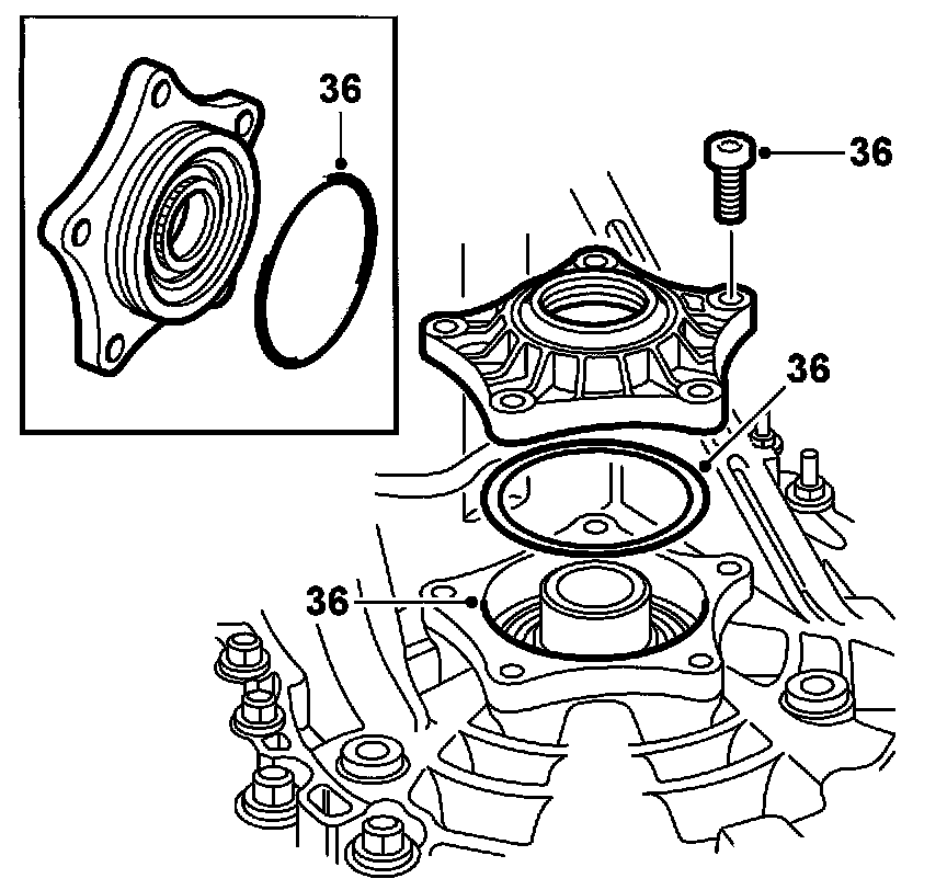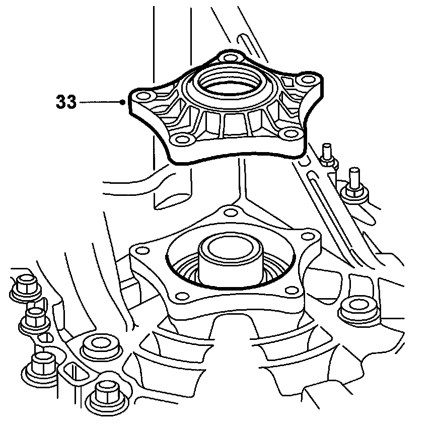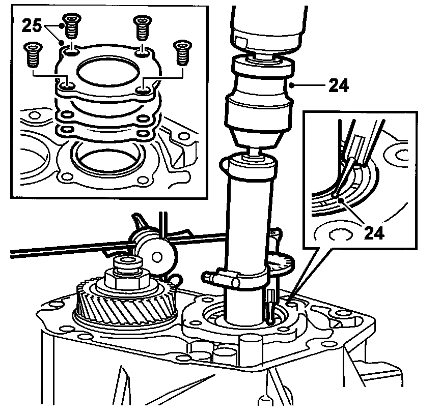 Thread in the bearing race, but not all the way. Fit the bearing support without O-ring, shaft seal and shims. Tighten 4 screws.