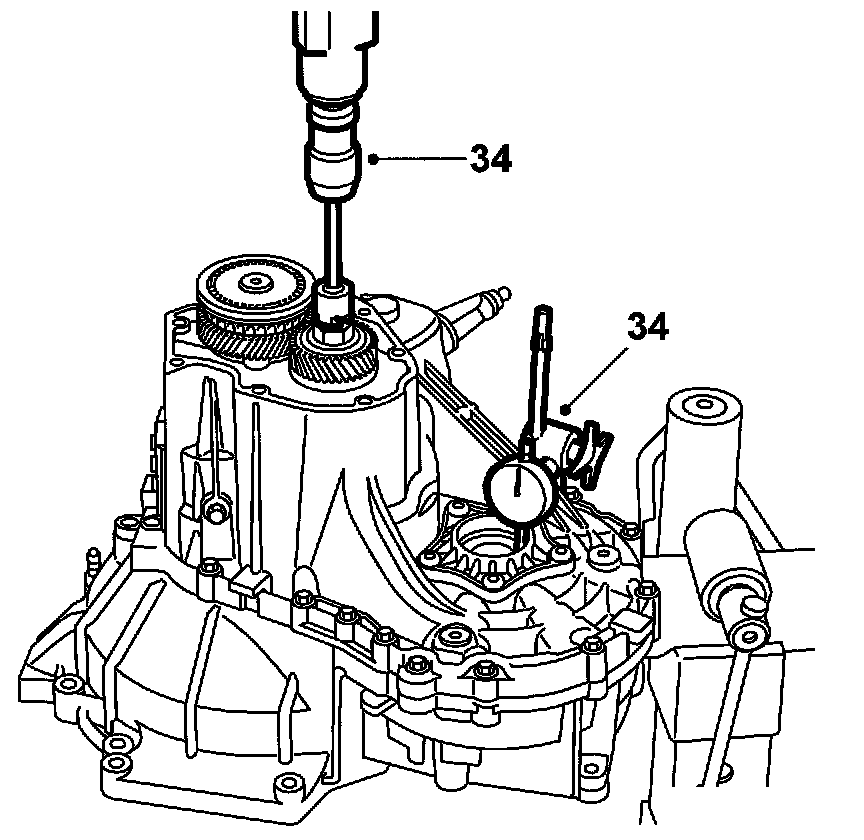 34. Fit 87 90 727 Bracket, dial gauge using 87 92 194 Dial gauge kit in the available hole. Set the tip at the differential housing. Run the output shaft using a drill and 87 92 053 Driver until the value on the dial gauge has stabilized. Reset the dial gauge.