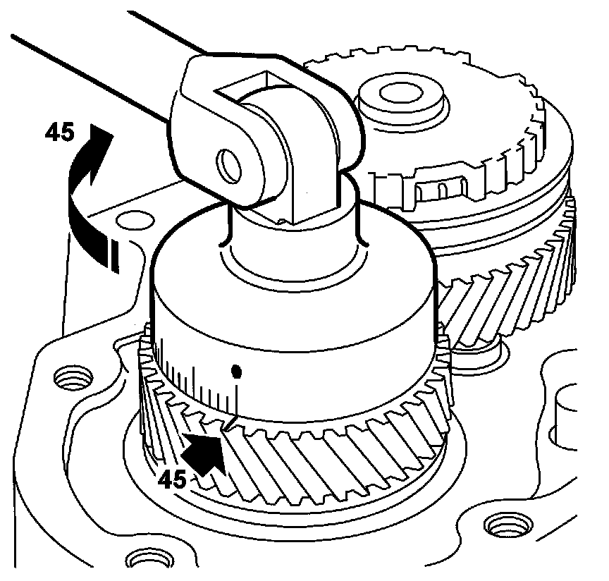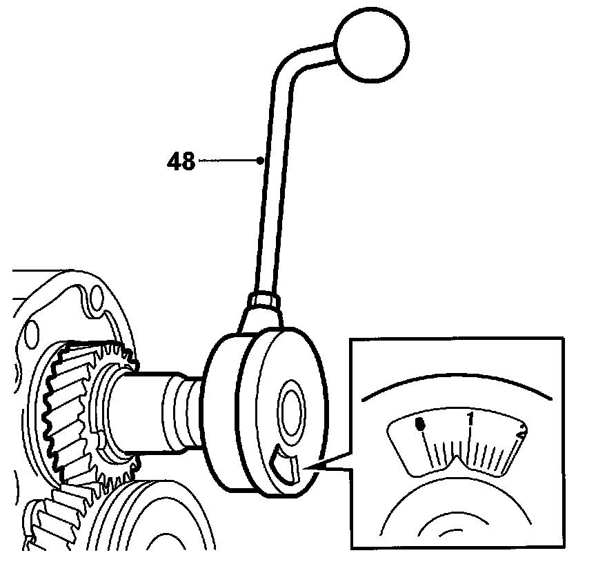 45. Pull in 2-3 stages until the zero graduation (0) of the tool (mm disc) is at the marked tooth. Measure axial play again as indicated in steps 41-45 to make sure the amount of preload is correct. Remove the tool and sleeve. If an old bearing is fitted on the output shaft, lock the nut and continue to step 52. If a new bearing is fitted, do not lock the nut and continue with the next point.