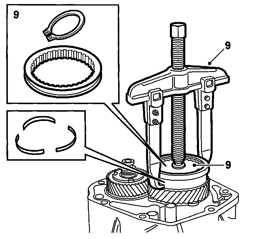 9. Remove the circlip securing the 5th gear synchromesh hub. This is made easier by first carefully tapping down the hub. Lift off the synchromesh sleeve and then use 87 91 287 Puller, 150 mm, 87 91 303 Arm, 150 mm and 87 92 640 Tool, 5th gear synchromesh hub to lift the 5th gear's synchromesh hub (grease the puller's tip). Save the leaf springs. Then lift up the pinion, baulk ring and needle bearing.