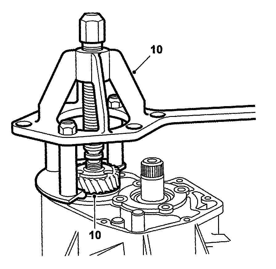10. Remove the gear wheel for 5th gear with 87 92 566 Puller. 89 96 084 Puller, wheel hub and 87 91410 Sleeve.