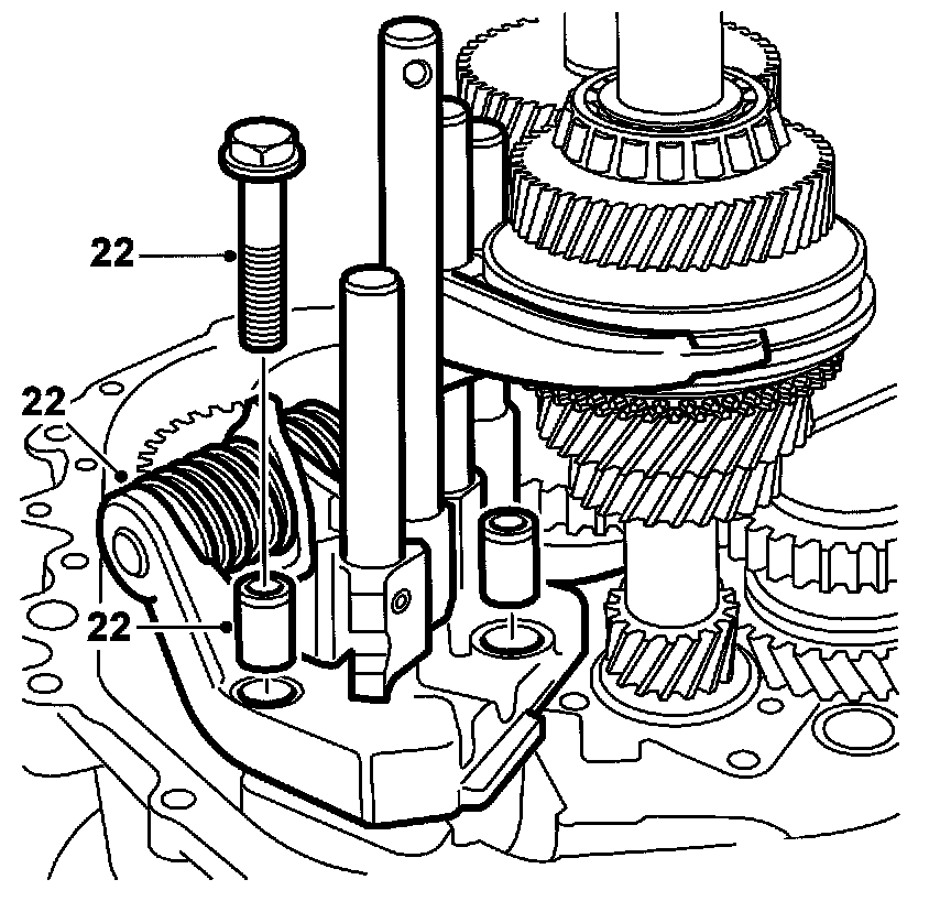 22. Disengage reverse. Remove the bolt and lift the selector mechanism slightly to lift the locating sleeves from their seats. Lift off the sleeves.