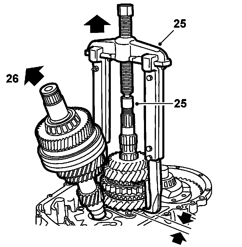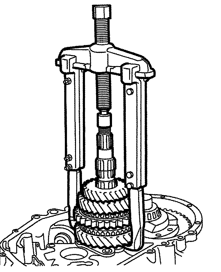 25. Fit 87 91 287 Puller, 150 mm with 87 91 303 Arm, 150 mm under the 1st gear wheel on the output shaft. Fit 87 91 410 Sleeve to protect the end of the output shaft. Pull slightly and fit 87 92 103 Assembly fixture, 1 to hold the 1st and 2nd gear synchromesh assembly together. Fit a cable tie round the tools and drive assembly. Pull up all gears about 15 mm on the output shaft.