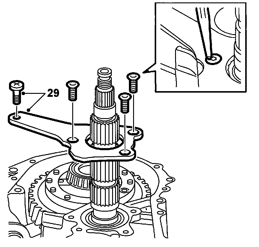 29. Remove 4 bolts and remove the output shaft bearing support. Tap with a drift to easier release the bolts if needed.