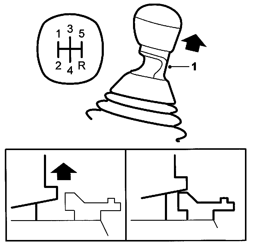 In order to engage reverse (R), a latch collar under the lever knob must be lifted (1). In the neutral position, the spring-loading inside the gearbox causes the gear lever to attempt to maintain an equilibrium position between 3rd and 4th gears. This is to make it easy for the driver to find his way around the gear layout and avoid engaging the wrong gear.