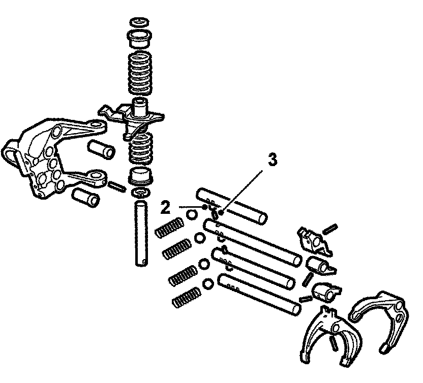 In order to prevent more than one gear being engaged at a time, the gearbox has a dual position detent mechanism. This detent mechanism primarily consists of 3 balls (2) and 2 cylindrical pins (3) which are aligned ball-pin-ball... through the bearing brackets and selector shafts. When a gear is engaged, a corresponding selector shaft is pushed in or out, breaking the alignment between balls and pins. The balls then assume the positions where they lock other selector shafts.