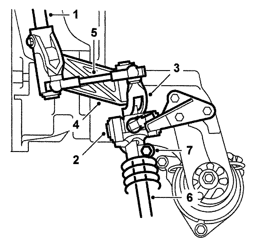Between the selector shaft (1) in the gearbox and the "rubber universal joint" (2) is a linkage which transfers torsional and shear forces from the gear lever to the selector shaft. The selector rod lever (3) is mounted via a link in a bracket in the rear engine mounting. The plastic link (4) is axially linked to the selector rod and radially mounted in the selector rod lever. The plastic link transfers the shear and tensile forces to the selector shaft in which it is axially mounted. The lever is fixed to, and transfers the selector rod's torsional forces via, the parallel link (5) to the lever which is fixed to the selector shaft and axially mounted in the plastic link.