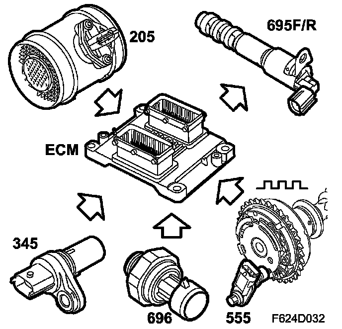 ECM regulates camshaft position based primarily on engine speed and load. A number of other values are used for minor compensations. Based on these values, ECM calculates requested camshaft position, converts it to the necessary PWM value and sends it out to the valves. A Hall sensor reads the position of the aperture discs and thereby the current position of the camshafts. ECM compares the requested and actual positions. If there is deviation, the PWM voltage to the valves is corrected.