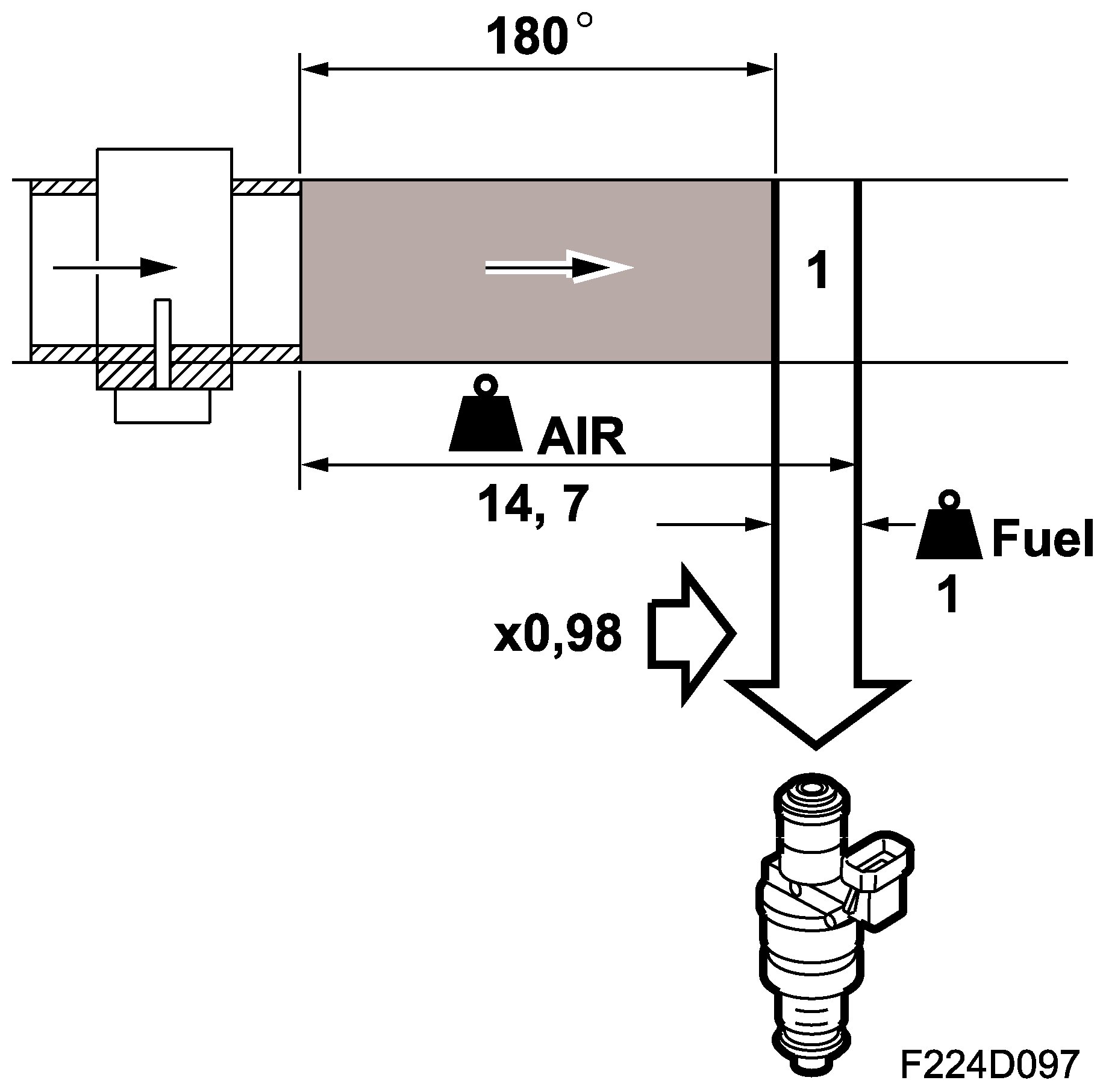 The basic fuel quantity has been calculated to give an air/fuel ratio of 14.7:1. The calculation is based on the reading obtained from the mass air flow sensor. Air leaks and tolerances in the mass air flow sensor can affect this calculation. When the fuel quantity is subsequently converted into injection duration, the control module assumes the flow through the injectors to be functioning faultlessly. Tolerances in the injectors and variations in the fuel pressure can affect this calculation.
