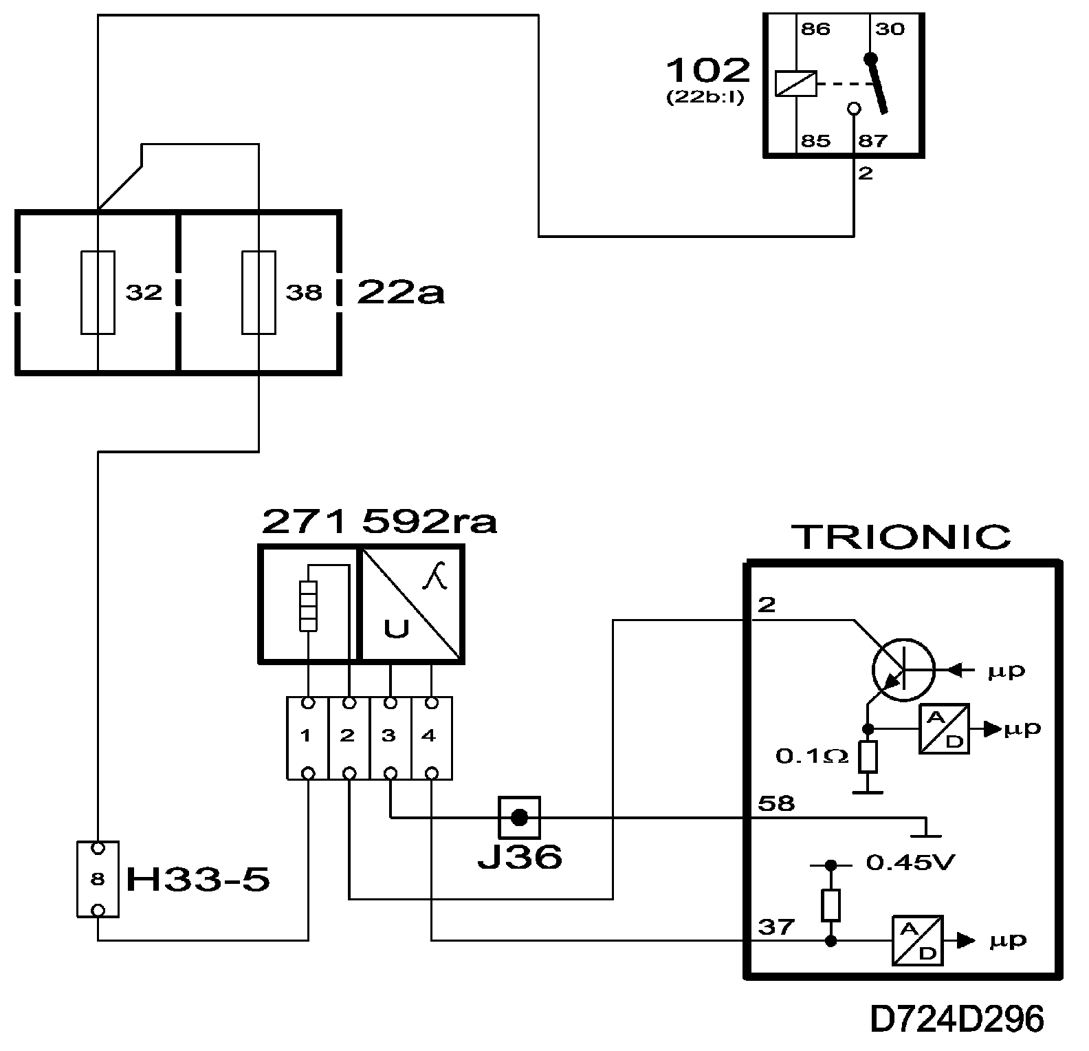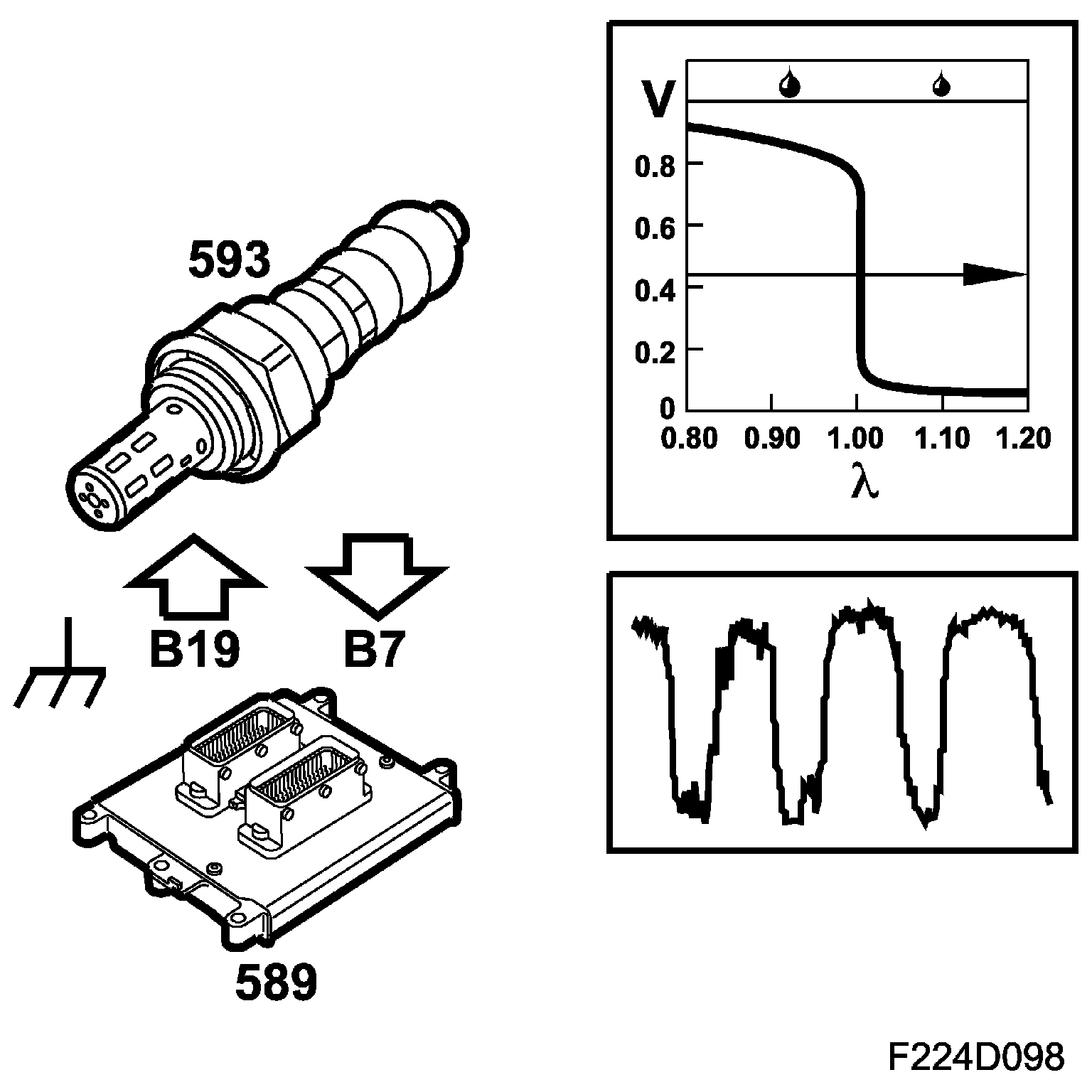 In order to supply a voltage quickly after starting, the oxygen sensor must be preheated. The preheating is supplied with B+ from the fuel pump relay via fuse 3 and is grounded via control module pins 40(B) and 57(B)9. The preheating circuit ground is PWM so that the preheating effect can be regulated.