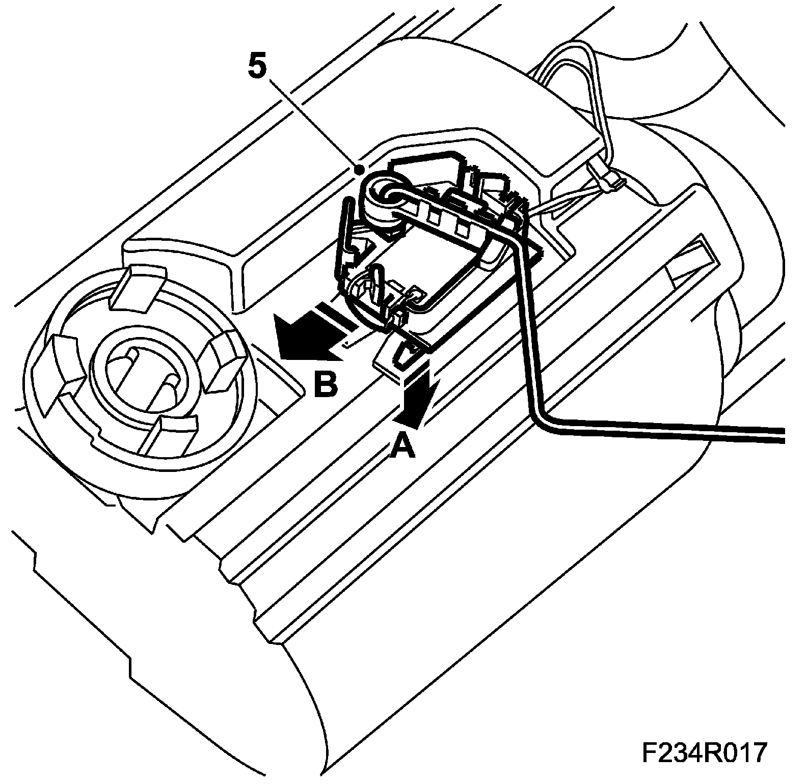 4. Prise out the fuel level sensor cable terminal, pin no. 2 (grey cable), pin no. 3 (white cable), with cables from the connector. Use 85 80 151 Kit, connector pin removal tool.