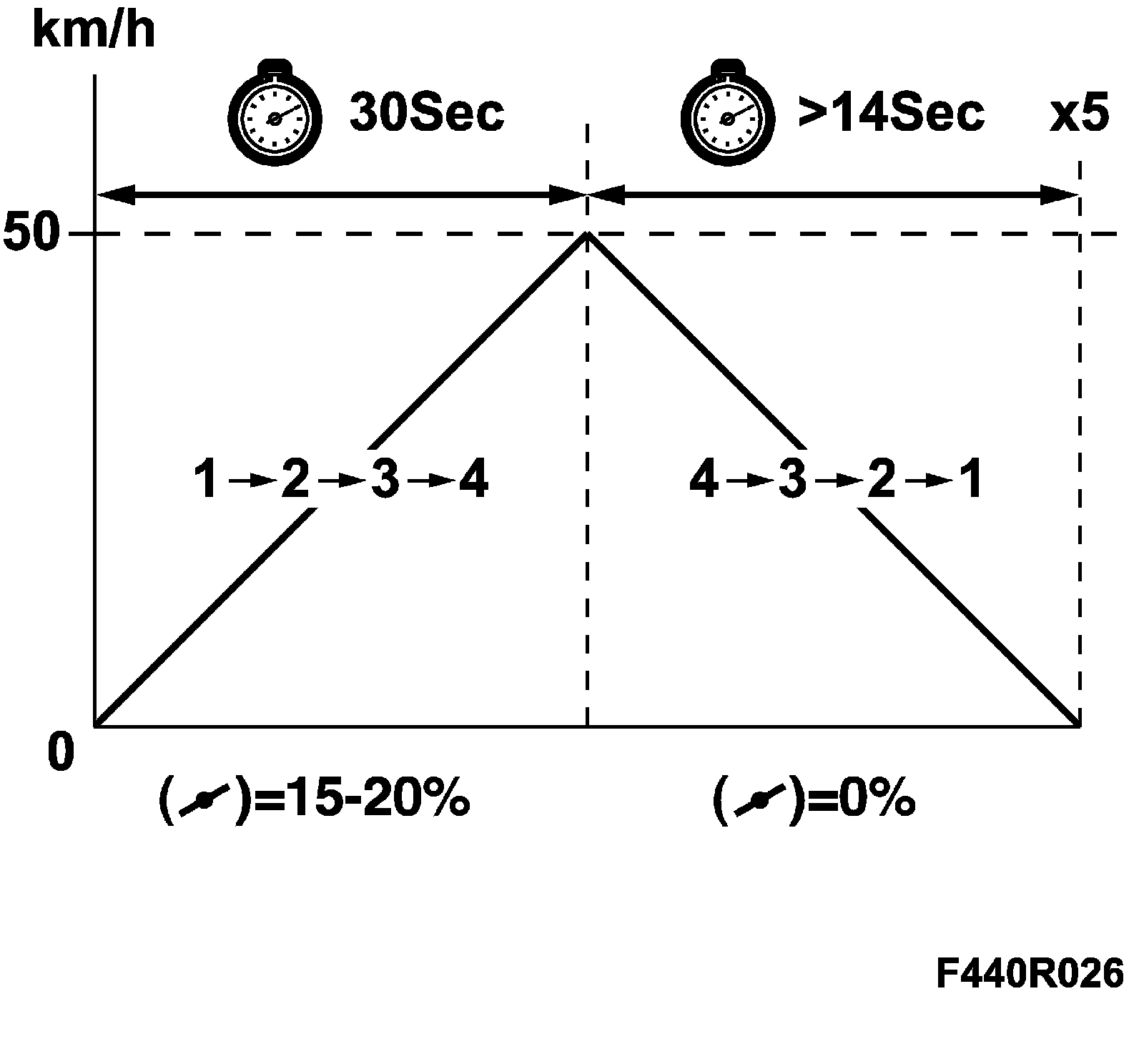 4. Adaptation for shifting up and down is done by driving on a road. Engage D and accelerate up to just over 50 km/h with the accelerator pedal at a constant position (approx. 15 - 20% depressed) until 4th gear has engaged. Brake until the car is stopped. Acceleration up to 50 km/h must take more than 30 sec. and braking must take more than 14 sec. Repeat the above 5 times.