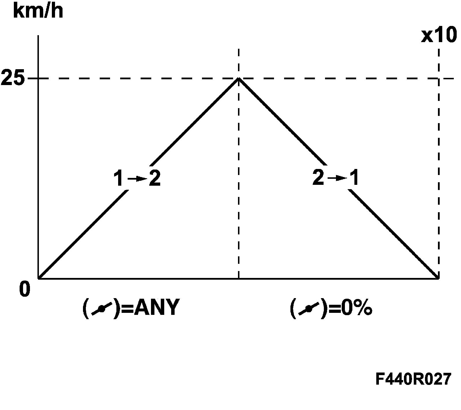 5. Adaptation for manual shifting from 2nd to 1st gear is carried out on-road. Engage M2 with the selector lever. Accelerate to 25 km/h. Engage M1 and brake smoothly until the car is stationary. Repeat this procedure 10 times.