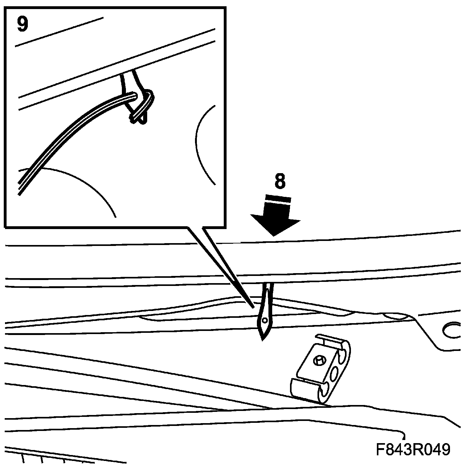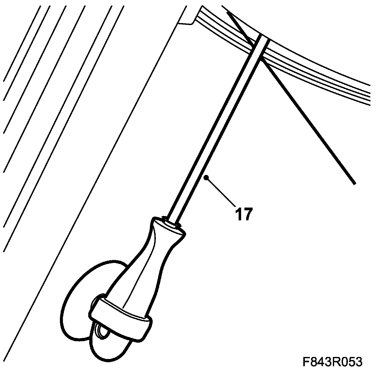 17. When the wire starts to cut along the top edge of the windscreen, fit the protective tool with suction cup between the cutting wire and metal roof to protect the interior equipment. Move the wire coiler and protective tool successively as the window comes loose.