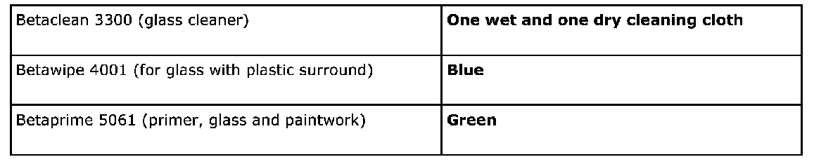 7. Carefully wash the edges of the window with Betawipe 3300. Carefully wipe the edges using the wet cleaning cloth. Dry with the dry cleaning cloth provided in the adhesive kit. Avoid touching the cleaned surface.