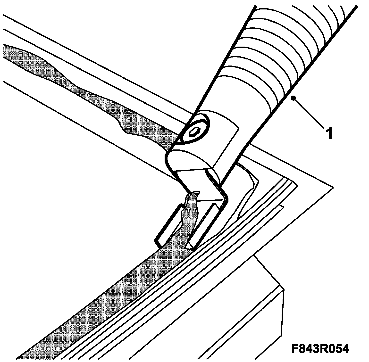 1. Cut down the bead of adhesive on the window flange to a maximum height of 2 mm. Use the cutting tool provided in the removal kit. If the old window is to be refitted, the bead of adhesive on this must also be cut down to max. 2 mm. Old and firmly adhered adhesive gives a good base for the new adhesive. Loose adhesive on the glass or metal must be removed.