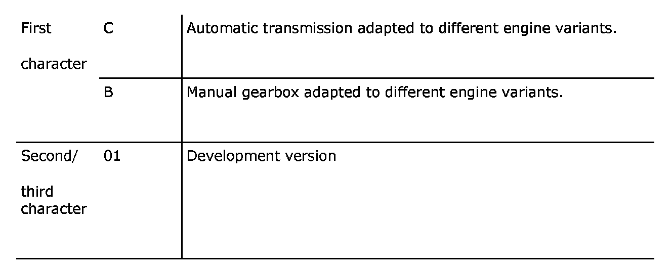 The type designation of an automatic transmission consists of 3 groups of characters as shown below: