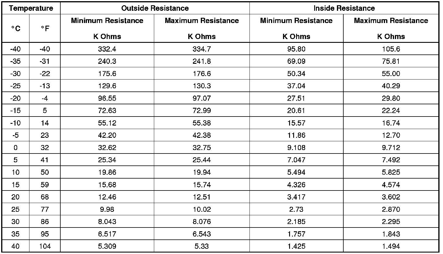 Sensor Resistance Table