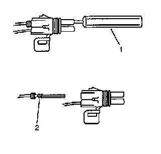 4. Insert the Weather Pack(R) terminal removal tool J 38125-10A (GM P/N 12014012-1) into the front (mating end) of the connector cavity until it rests on the cavity shoulder (1).