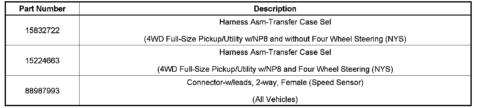 On the full-size pickup and full-size utility models, replace the 2.2 m (88 in) pigtail harness that runs from the C151 connector under the hood to the transfer case. Use either harness P/N 15832722 or 15224663 depending on vehicle equipment. Refer to Propshaft Speed Sensors Front Axle Actuator and Transfer Case Shift Control Switch schematic in SI.