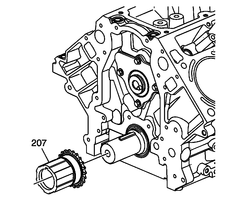 3. Install the crankshaft sprocket (207) onto the front of the crankshaft. Align the crankshaft key with the crankshaft sprocket keyway.