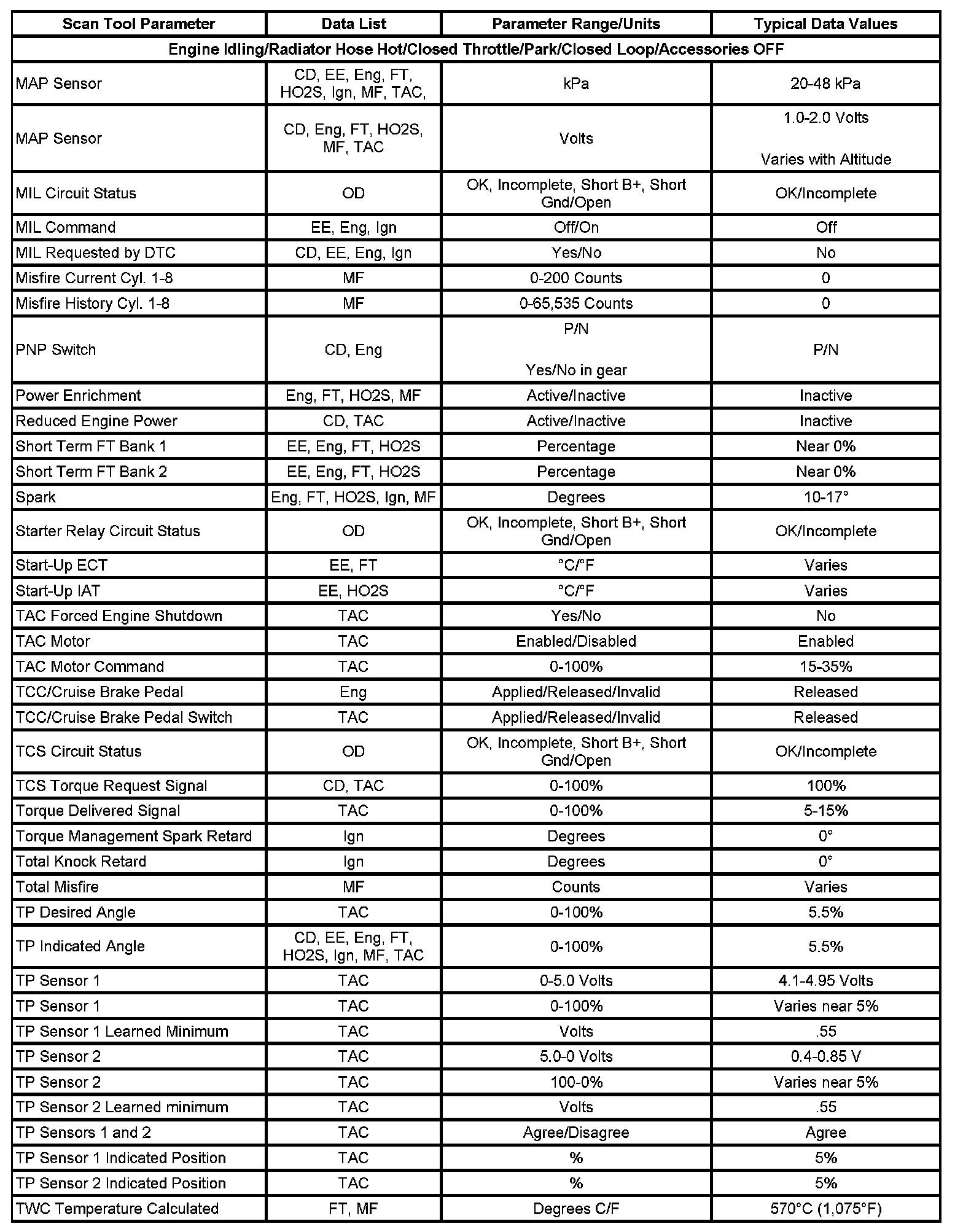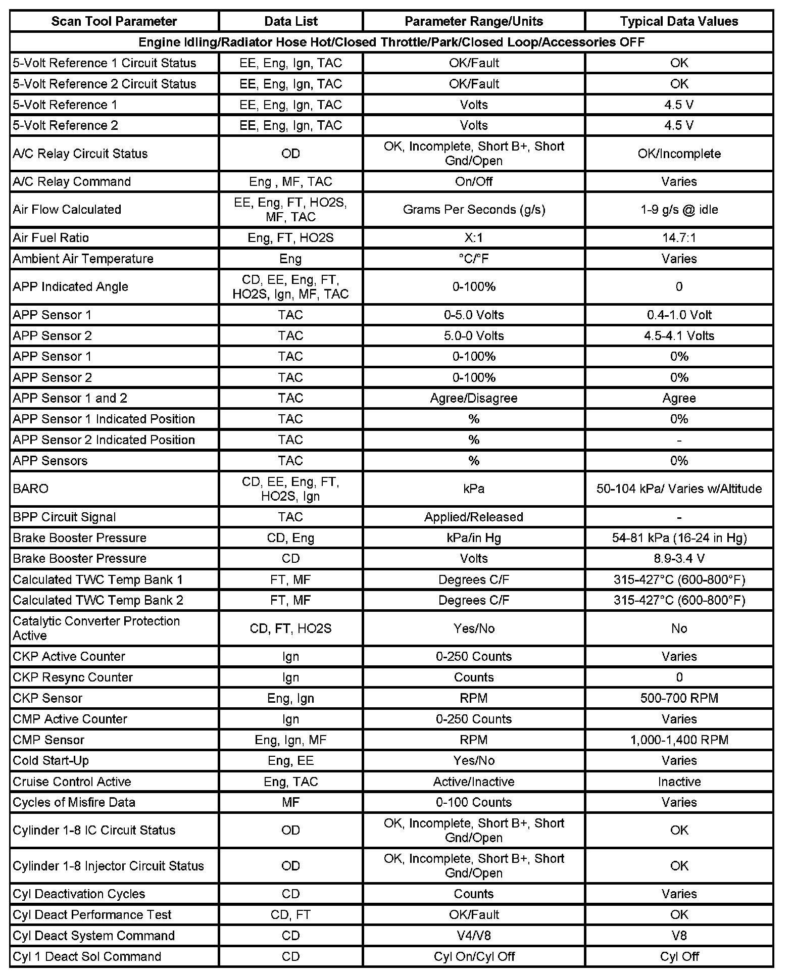 Scan tool values from a properly running engine may be used for comparison with the engine you are diagnosing. The Engine Scan Tool Data List represents values that would be seen on a normal running engine at idle.