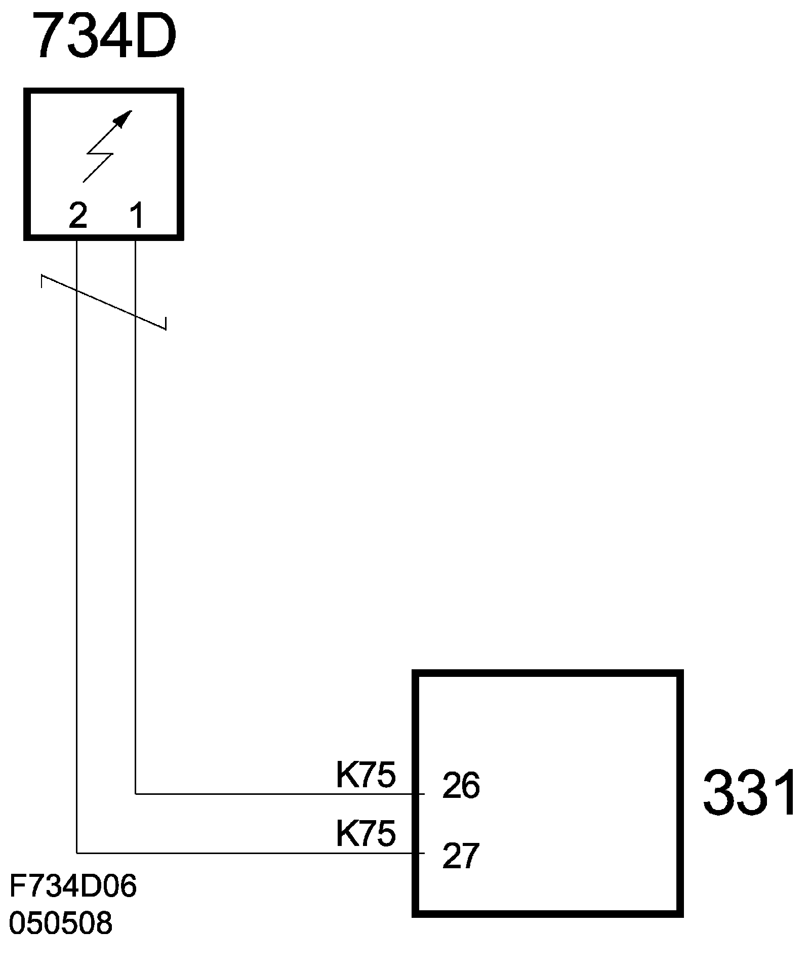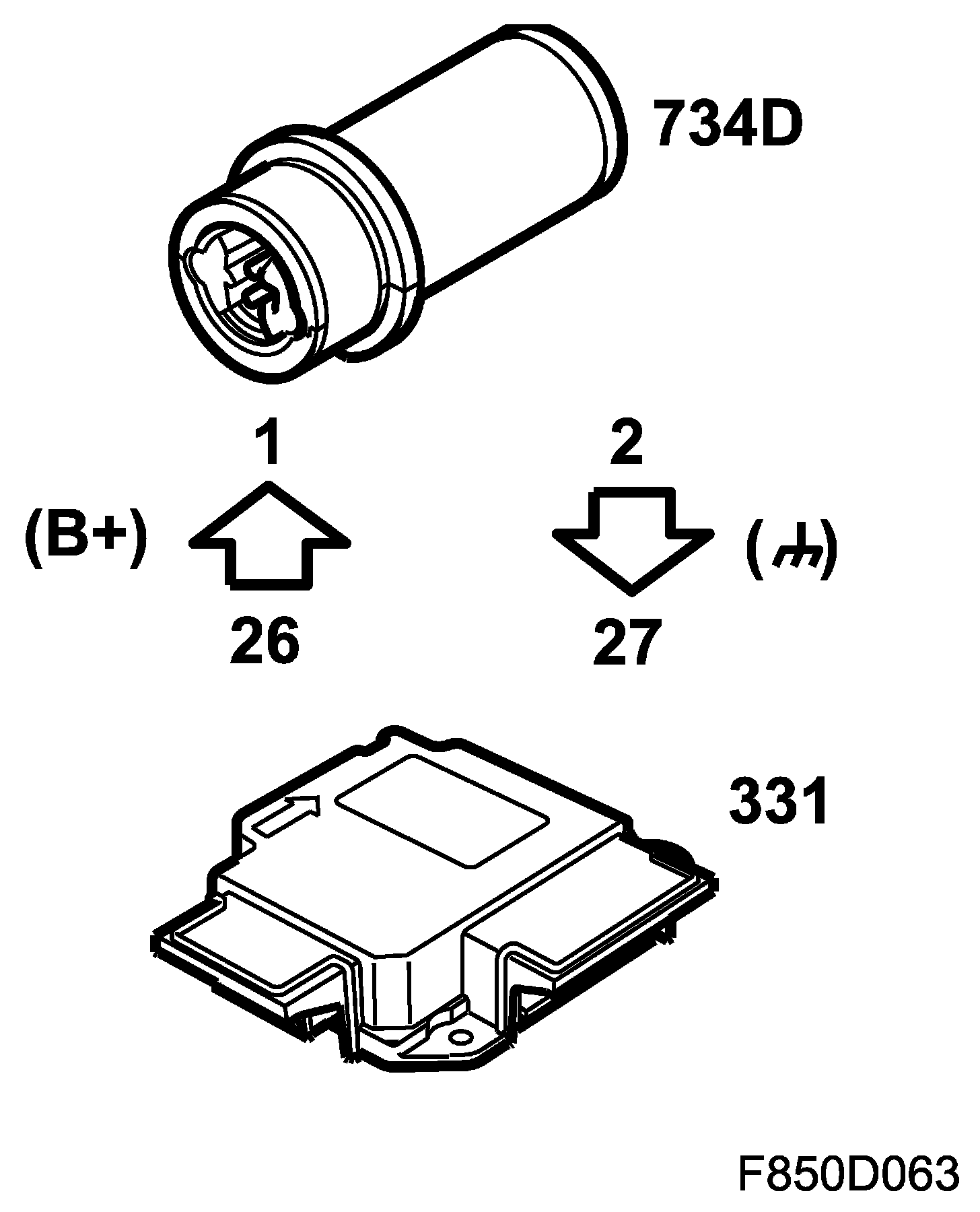 On activation, the driver's side activation unit (734D) is supplied with B+ from the airbag control module pin 26. The activation unit (734D) is grounded from control module pin 27.