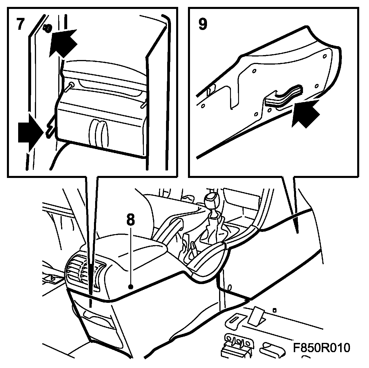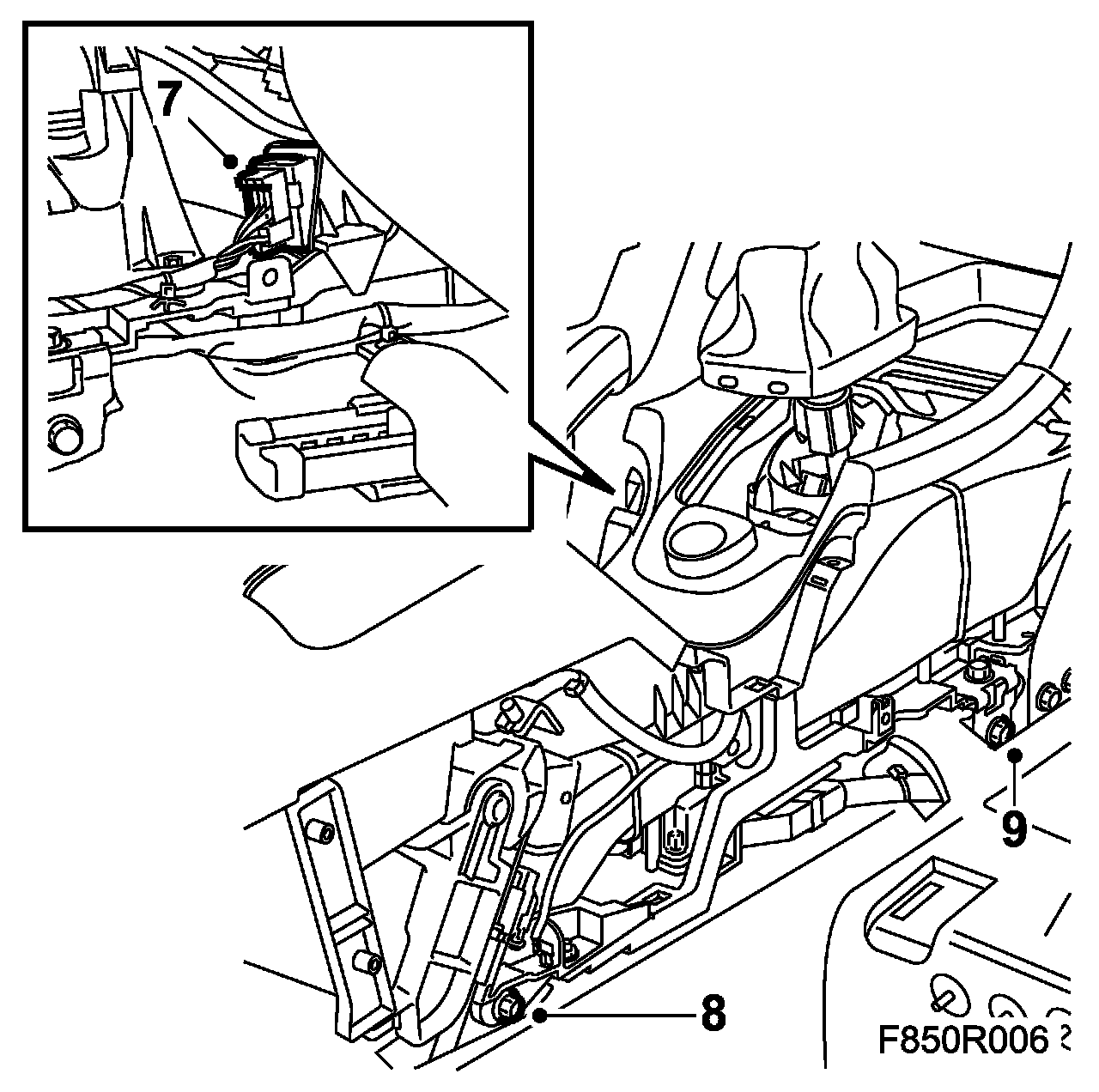9. Remove the front legroom adjuster screws on the center console's aluminium frame.