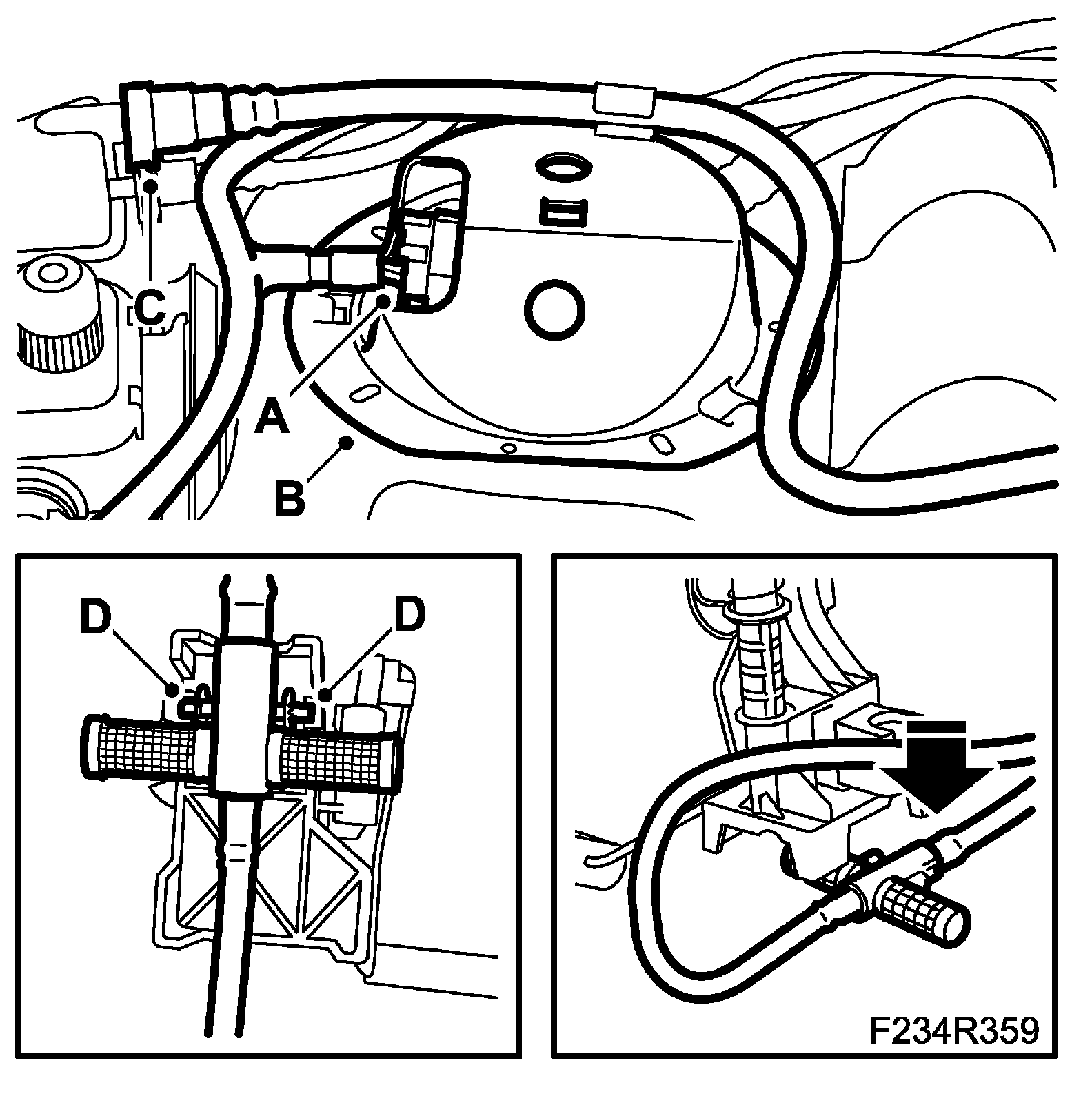 2. Fit the fuel level sensor in the tank and snap the sensor bracket (D) into position.