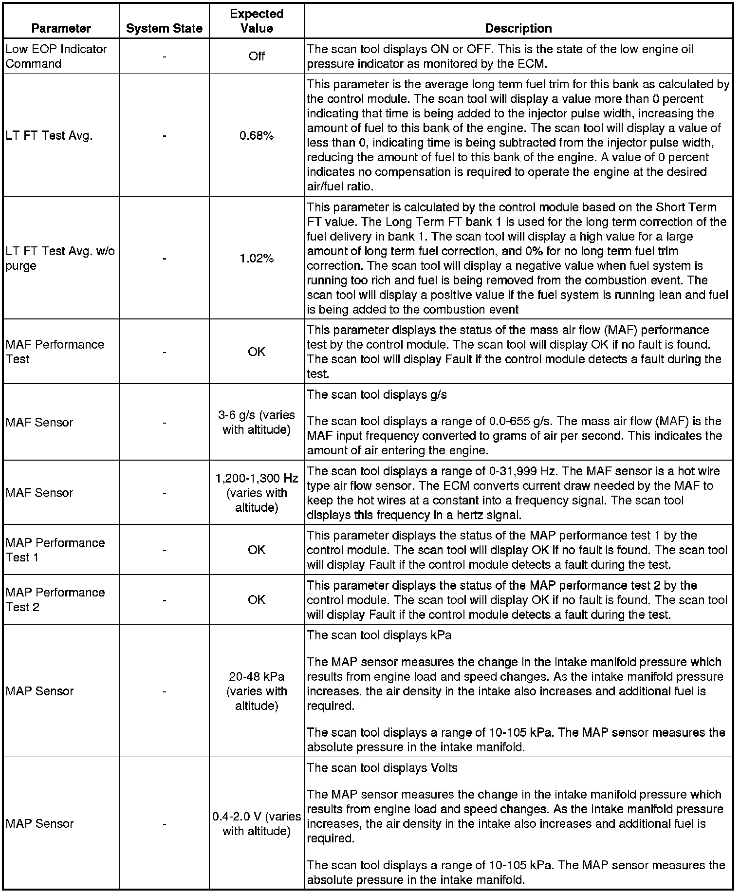 The scan tool values from a properly running engine may be used for comparison with the engine you are diagnosing. The Engine Scan Tool Data List represents values that would be seen on a normally running engine.