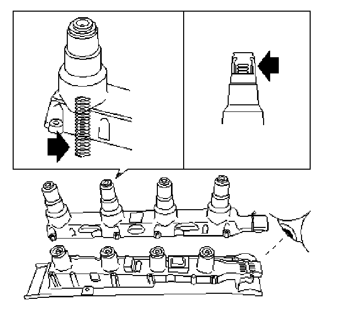 ^ Position the ignition discharge module so that the spark plugs are inclined downwards and the oil in the ignition coils covers the HT outputs.