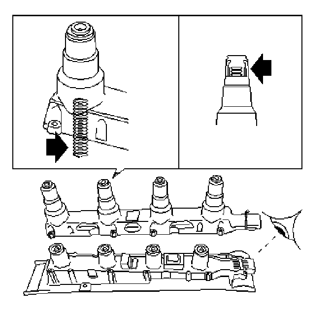 ^ Position the ignition discharge module so that the spark plugs are inclined downwards and the oil in the ignition coils covers the HT outputs.