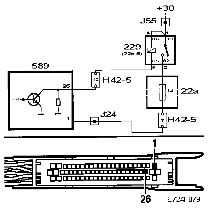 The lead from pin 26 of the control module to pin 5 (85) of the relay holder is faulty.