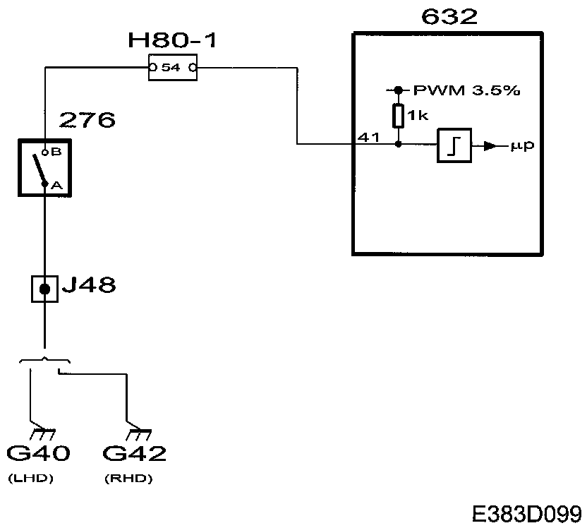 A pulse width-modulated (approx. 3.5%) voltage is supplied continuously from the control module via a 1 kohm pull-up in TWICE to the switch. From this voltage, the control module can detect whether the bonnet is opened when the alarm is armed by testing the voltage at the input concerned.