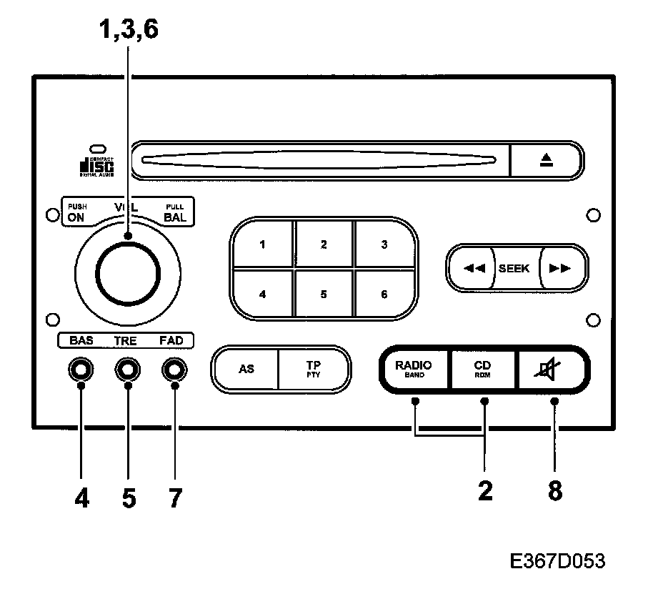 The audio system is turned on/off by pressing the volume control knob. When switched on, the system starts with the last settings that were active.